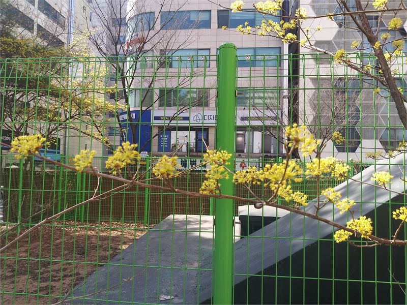 '철망 속 갇힘'을 열어젖히려는 듯 산수유꽃이 활짝 피었다.