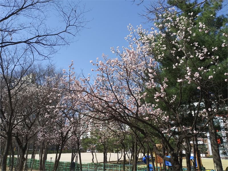 산수유가 연노란색을 슬쩍 갖다놓더니 그 이틑날엔 매화가 피고, 앵두꽃이 뒤질새라 새단장을 한다고 총총걸음입니다. 벚꽃은 얼굴을 화사하게 드러냈습니다. 뽐냄은 왕벚꽃이 더합니다.