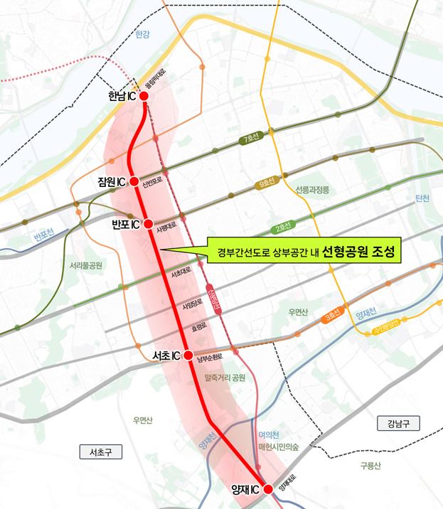 서울시 관계자는 “양재~한남까지 폭이 조금씩 다른 공원을 조성하는 등 전략적 활용 계획을 마련할 것”이라며 “지하화 구간과 주변 지역 개발을 연계하는 방안도 검토하겠다”고 말했다.