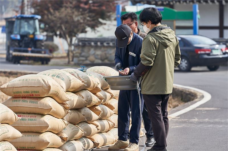 벼 수매현장에서 검사원이 대야에 담긴 벼의 품질 등을 살펴보고 있다. 정창현 기자