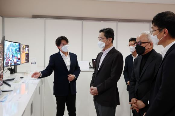 이재용 삼성전자 회장이 지난 2월 삼성디스플레이 아산캠퍼스에서 전시된 디스플레이 제품을 보며 설명을 듣고 있다. 삼성전자 제공