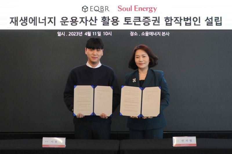 이현기 이큐비알홀딩스 대표(왼쪽)와 안지영 소울에너지 대표가 11일 토큰증권 합작법인 설립 기념촬영을 하고 있다. 소울에너지 제공