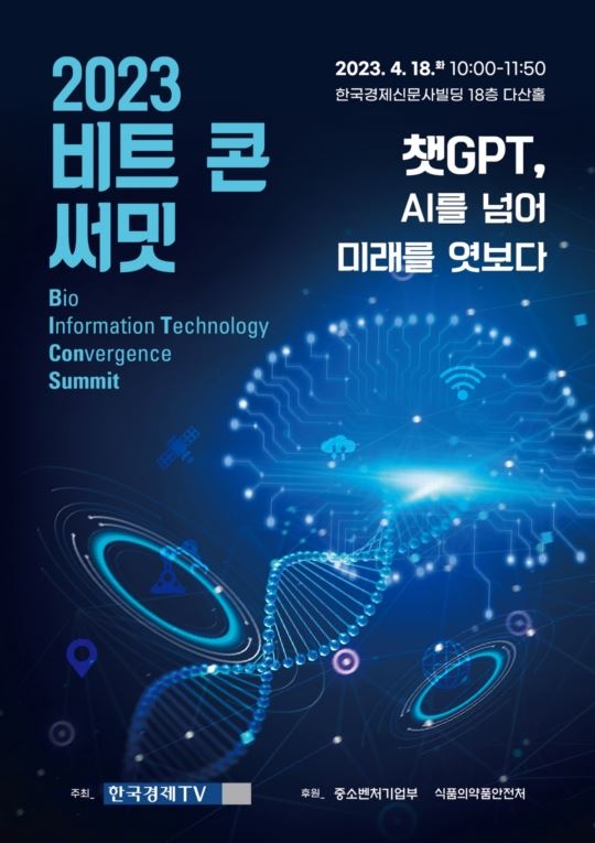 한국경제TV가 주최하고 중소벤처기업부와 식품의약품안전처가 후원하는 '2023 비트 콘 써밋'이 오는 18일 오전 10시 한국경제신문사빌딩 18층 다산홀에서 열린다. 이날 자리에서는 미래 사회를 주도할 핵심 키워드인 '챗GPT'가 국내 IT 산업과 BT 산업에 미칠 영향을 알아본다.