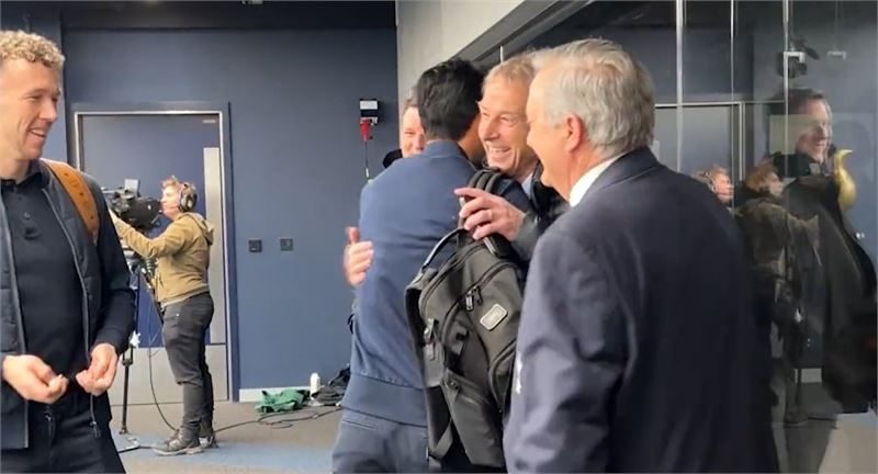 손흥민(가운데)과 클린스만 한국대표팀 감독이 토트넘 홈구장에서 재회하고 있다. 토트넘 트위터 캡처