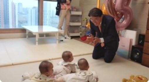 네쌍둥이를 흐뭇하게 바라보는 최정우 포스코그룹 회장. 네쌍둥이 엄마 박두레 씨 인스타그램 캡처