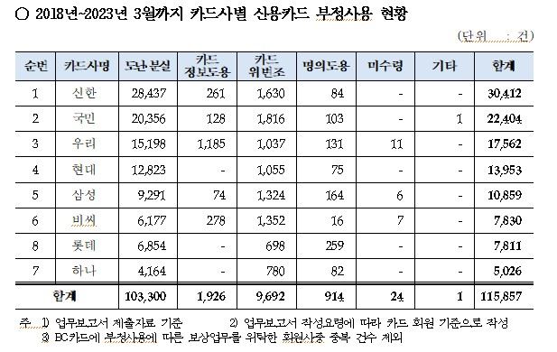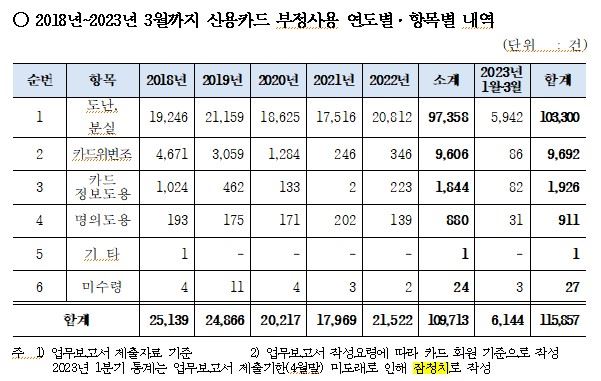 강민국 의원실(경남 진주시을)이 금융감독원에 자료 요청을 통해 받은 '신용카드 부정사용 내역'에 따르면 지난 2018~2023년 3월, 5년여간 발생한 부정 사용 건수는 총 11만 5857건에 달하는 것으로 조사됐다 .