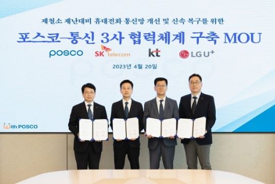 포스코가 이동통신 3사와 제철소 재난 대비 휴대전화 통신망 개선과 신속한 복구 체계 구축 양해각서(MOU)를 체결했다고 21일 밝혔다.