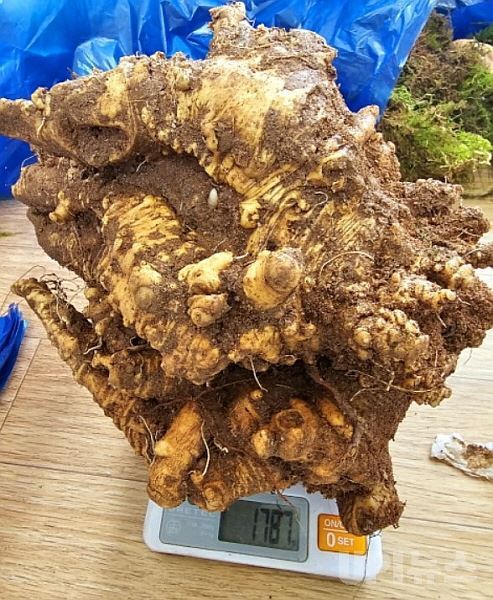 경남 하동 지리산 자락에서 발견된 야생 더덕. 저울추가 무려 17.87kg을 가리키고 있다. 한국전통심마니협회 제공