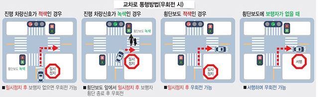 개정안 시행규칙에 따라 교차로에서 우회전을 할 경우 보행자 유무와 관계없이 일시정지 해야 한다. 우회전 전용 신호등이 설치된 곳에선 우회전 전용 신호에 따라야 하고, 우회전 중이더라도 횡단보도를 건너는 보행자가 있으면 무조건 멈춰야 한다.