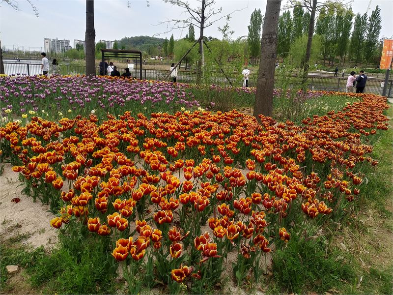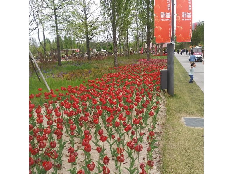 빨간색 튤립이 본이 완연했음을 알리고 있다. 서울식물원에 여기저기 색색의 튤립이 피어 있다.