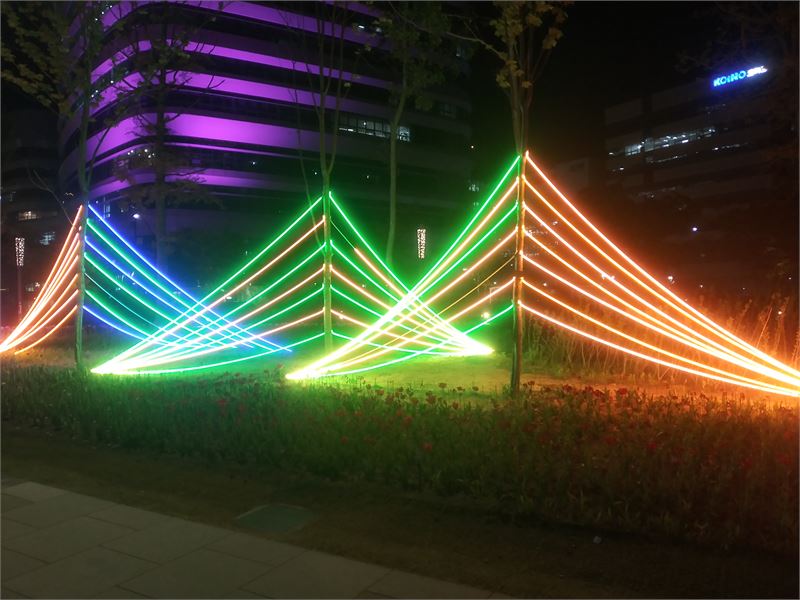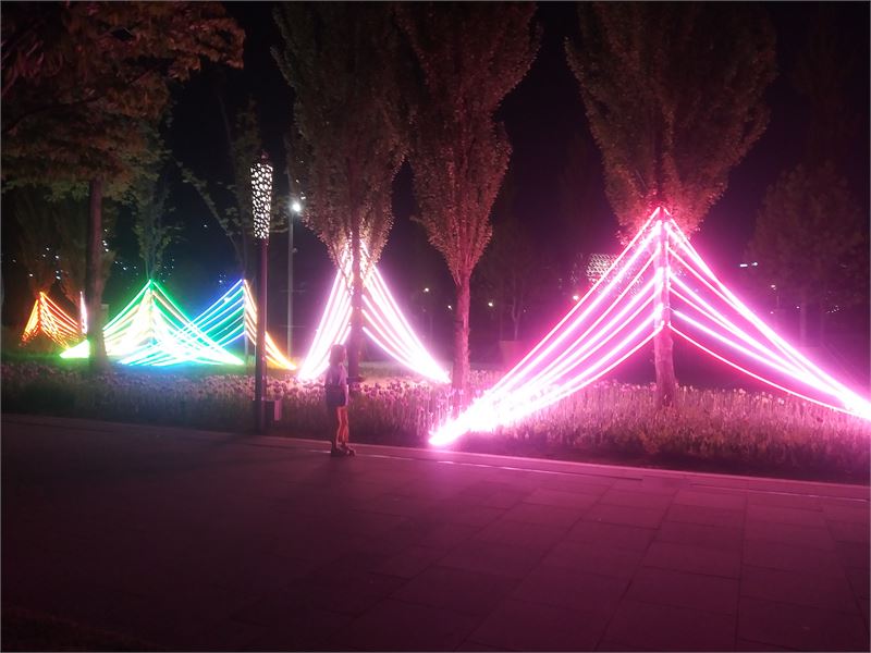 서울식물원의 색다른 야경. 고무 호스에 야광을 넣어 나무에 설치한 모습.