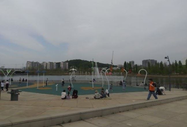 서울식물원 호수 분수대 모습. 앞쪽은 여름철 물놀이장이다.