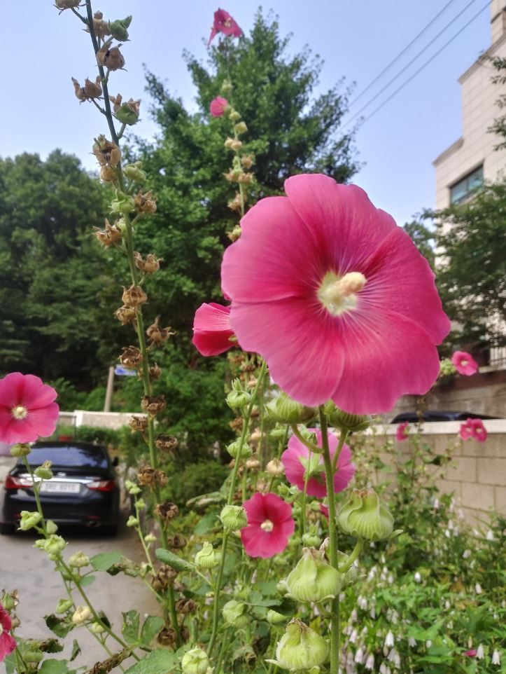 지난해 6월 말 화사하게 핀 접시꽃 모습. 이상 정기홍 기자