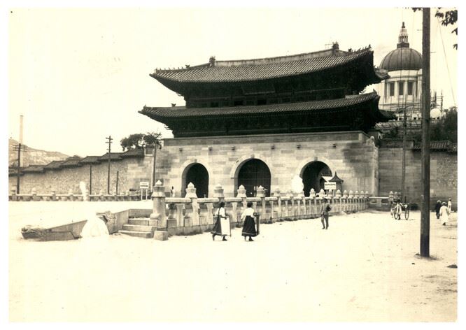 1923년께 찍은 것으로 추정하는 광화문과 그 앞 월대의 풍경. 난간석을 둘렀지만, 남쪽 들머리 왕의 어도는 대부분 경사로로 바뀌었고 서쪽과 동쪽 끝부분에만 계단 얼개를 남겨놓았다. 국립서울문화재연구소 제공