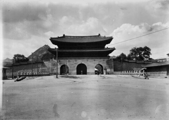 1917년께 촬영한 광화문과 앞 모습. 월대의 난간석은 있으나 계단은 사라지고 어도와 좌우 계단은 모두 경사로로 바뀌었다. 국립중앙박물관에 소장된 유리건판 사진이다. 국립서울문화재연구소 제공