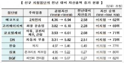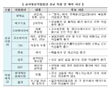 공시대상기업집단으로 새로 지정된 집단 8개는 LG에서 분리된 LX와 에코프로, 고려에이치씨, 글로벌세아, DN, 한솔, 삼표, BGF(CU 편의점)이며, 제외된 집단(2개)은 현대해상화재보험과 일진이다.