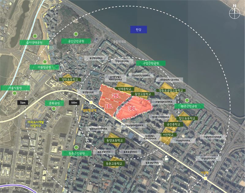 서웅 강서구 가양동 CJ공장부지 위치도. 맨왼쪽이 마곡지구이며 서울식물원이 자리한다. 왼쪽은 지하철 9호선 양천향교역, 오른쪽은 동의보감을 쓴 허준 선생의 태어난 곳으로 허준박물관이 위치한다. 위쪽은 한강이다. 인창개발 제공