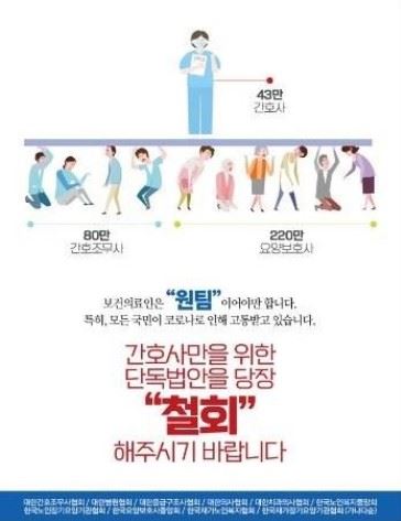 의사와 간호조무사 등 다른 직역은 간호법 제정안이 국회를 통과하면 총파업에 나서겠다고 예고했다. 국민의힘은 간호법 제정안에 대해 대통령에게 재의요구권(거부권) 행사를 건의한다는 방침이다.