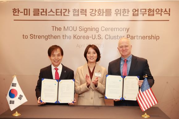 KAIST가 28일(현지 시간) 미국 보스턴에서 하버드대 매사추세츠 종합병원과 의사과학자 양성을 위한 MOU를 체결했다. 이광형 KAIST 총장, 이영 중소벤처기업부 장관, 데이비드 브라운 하버드대 매사추세츠 종합병원장(왼쪽부터). KAIST 제공