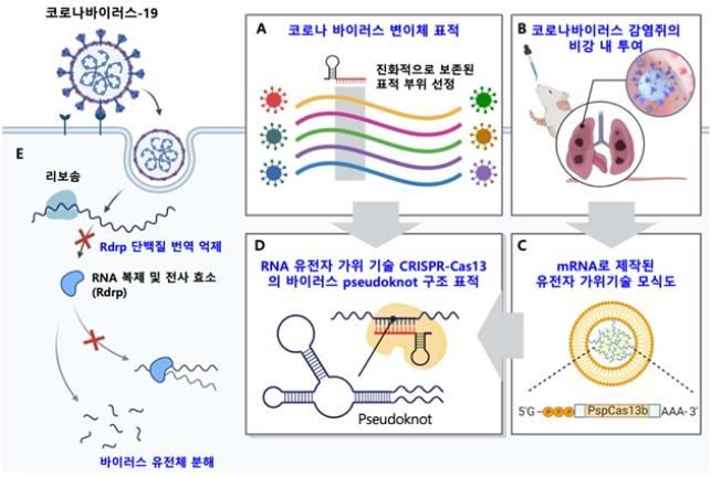 연구진은 RNA(리보핵산) 유전자 가위기술(CRISPR-Cas13)을 이용해 슈도낫 부위(pseudoknot region)를 잘라내 99.9% 바이러스 증식 억제 효과가 있는 것을 확인했다. 슈도낫 부위는 변이가 잘 일어나지 않는 보존성이 높은 곳으로, 코로나19 바이러스의 가장 취약한 급소임을 보여주는 것이다.