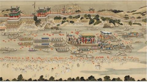 달밤에 대동강에서 뱃놀이를 즐기는 장면이다. 자세히 보면 강변에는 횃불을 든 사람들이 즐비하고 강물 위에도 등롱을 띄워 놓고 있다.