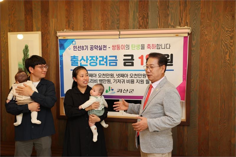 충북 괴산군의 한 가정이 셋째와 넷째 쌍둥이를 출산해 무려 1억 원의 출산장려금을 받게 돼 화제가 되고 있다. 괴산군이 지난해 2000만 원이던 셋째 아이 출산장려금을 올해부터 5000만 원으로 대폭 올렸는데 첫 수혜자가 나온 것이다.