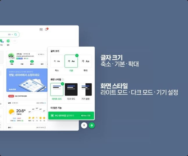 글자 크기를 설정 기능과 라이트·다크 색상 조정 화면. 네이버 공식 블로그 캡처