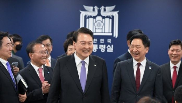 윤석열 대통령이 취임 1주년을 맞은 10일 서울 용산 대통령실 청사 내 기자실을 여당 지도부와 함께 방문하고 있다. 대통령실 제공