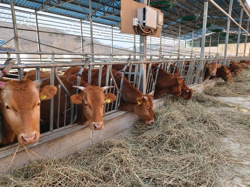 축산농가에서 한우들이 볏짚을 먹고 있다. 정창현 기자