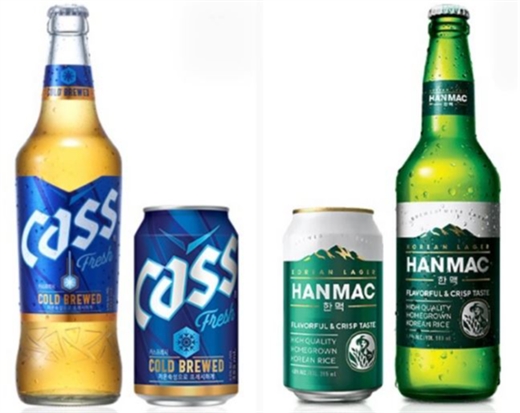 ‘카스’(왼쪽)와 최근 리뉴얼 한 ‘한맥’. 오비맥주 제공