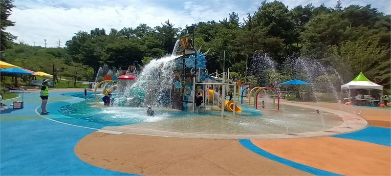 지난해 7월 중순 경남 진주시 금호지수변테마공원 물놀이장 모습. 강릉 지방이 16일 35.5도를 기록해 한여름보다 더 더워 한여름 물놀이장이 생각나게 했다. 경남 진주시 제공