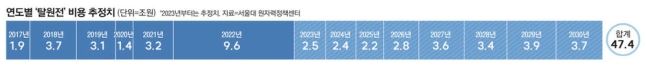 이 결과, 문재인 정부가 출범한 해인 2017년부터 2030년까지 발생하는 총비용은 47조 4000억원으로 예상했다.