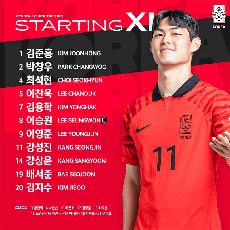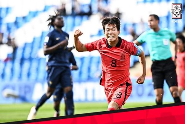 한국의 U-20 대표팀은 23일 오전 3시(한국시간) 남미 아르헨티나 멘도사 스타디움에서 열린 프랑스와의 2023 국제축구연맹(FIFA) '아르헨티나 U-20 월드컵' 조별리그(F조) 1차전에서 2대 1로 승리했다. 주장 이승원이 1골 1도움으로 승리를 이끌었다.