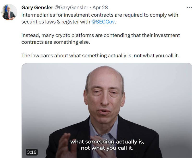 게리 갠슬러 미 SEC위원장이 4월 28일 자신의 트위터에서 암호화폐 거래소들이 규제를 지키지 않으면서 증권을 판매하고 있다고 지적하고 있다. 트위터 캡처
