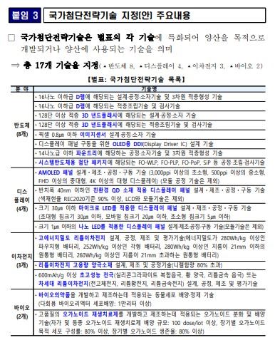 반도체 분야에서 8개, 디스플레이 4개, 이차전지 3개, 바이오 2개 등 총 17개 기술이다.