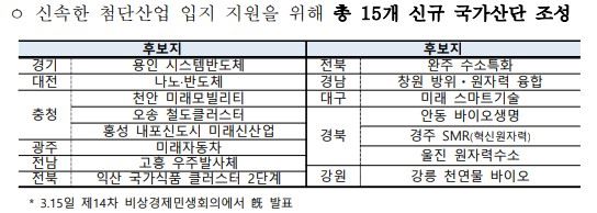 각종 첨단산업에는 신속한 입지를 제공하고 산업 생태계 확보를 지원하기 위해 총 15개 신규 국가산단도 조성한다. 국가첨단전략산업 주요 거점은 각종 혜택을 집중한 ‘특화단지’로 지정할 방침이다.