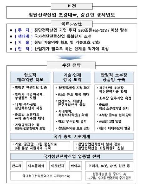 이를 위한 4대 목표로 ▲첨단전략산업 기업 투자를 2027년까지 '550조 원+a' 달성 ▲국가첨단전략산업 특화단지, 소재·부품·장비 특화단지 조성 ▲첨단기술 역량 확보 및 기술보호 강화 ▲산업계가 필요로 하는 인재 적기 육성 등을 내걸었다.