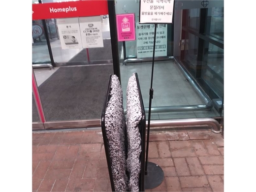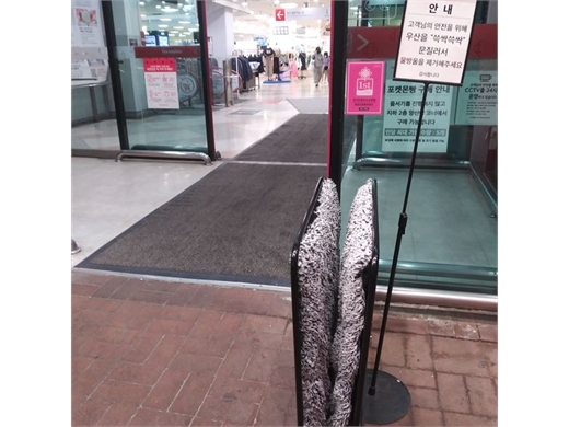 이 제거기가 빗방울을 다 제거할 수 있을까 했는데 보통 85%가 제거된다니 매장 안 바닥에 물이 떨어지는 것은 방지하는 셈입니다. 극세사 천뭉치는 털거나 말려서 금방 다시 사용할 수 있다고 하네요. 실제 이 대형마트 입구 안쪽을 확인해보니 빗방울이 없었습니다. 최근엔 단점을 보완한 다양한 기기가 속속 나오고 있답니다.