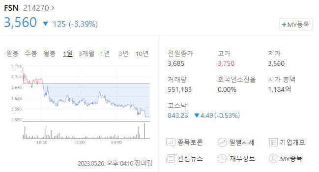 가장 크게 하락한 종목은 FSN이었다. 코스닥 종목인 FSN의 주가는 전거래일 대비 3.39% 하락한 3560원을 기록했다.