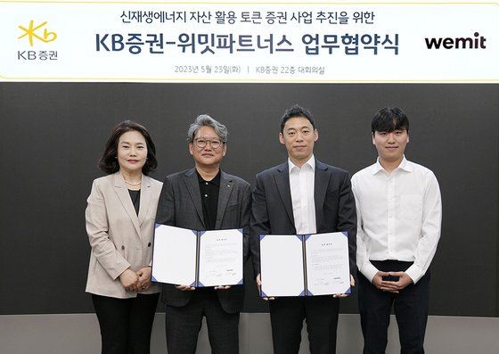 28일 KB증권에 따르면 지난 23일 위밋파트너스와 ▲신재생에너지 발전소 자산 기반 토큰증권 발행 및 유통 플랫폼 개발 사업 추진 ▲토큰증권 사업화 신탁 및 계좌관리기관 서비스 제공 ▲토큰증권 사업 전반의 협업 기회 발굴 등을 협력하기로 했다.
