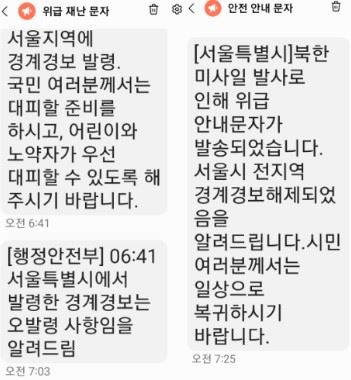 서울시는 이어 오전 7시 25분 '서울시 전지역 경계경보 해제되었음을 알린다. 시민 여러분께서는 일상으로 복귀하시길 바란다'는 문자를 보내 시민들을 다시 어리둥절하게 했다.