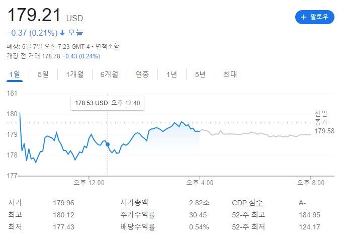 애플은 지난 5일(현지 시각) 미국 캘리포니아주 쿠퍼티노 애플 파크에서 열린 연례세계개발자회의(WWDC)에서 MR 헤드셋 '비전 프로'를 공개했다. 하지만 이날 애플의 주가는 0.76% 내린 179.58달러에 마감했다. 신제품 기대감에 장중 한때 184.95달러로 사상 최고치를 찍었지만 장중에 반응이 엇갈리며 하락 마감했다.