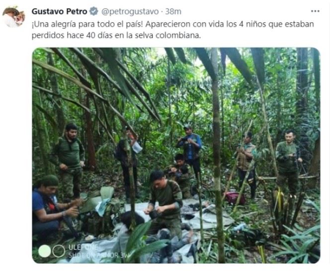 구스타보 페트로 대통령은 자신의 트위터에 "40일 전 콜롬비아 정글에서 실종됐던 아이들이 살아있는 것으로 보인다. 온 나라의 기쁨"이라고 썼다.