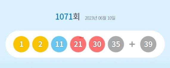 로또복권 운영사 동행복권은 제1071회 로또복권 추첨에서 ‘1, 2, 11, 21, 30, 35’가 1등 당첨번호로 뽑혔다고 이날 밝혔다. 2등 보너스 번호는 ‘39’이다.