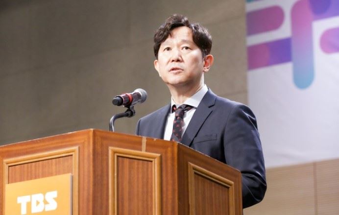 정태익 TBS 대표가 6월 12일 오후 서울 마포구 TBS 라디오공개홀에서 '공정성 강화를 위한 TBS 혁신방안'을 발표하고 있다. TBS 제공