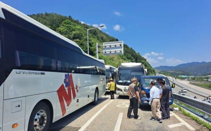 6일 강원 홍천군 화촌면 성산리 동홍천IC 입구에서 추돌 후 멈춰 서 있는 수학여행단 버스와 트럭, 승용차 모습. 소방 당국에 따르면 이 사고로 학생 등 30여 명이 다쳤다. 강원특별자치도소방본부 제공