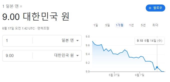 16일 오후 9시 30분 하나은행이 고시한 원·엔 재정환율은 100엔당 903.82원을 기록했다. 4월 말까지만 해도 100엔당 1000원을 오갔다.