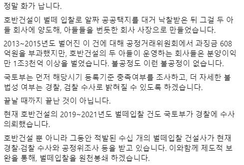 원 장관은 16일 자신의 페이스북에 “정말 화가 난다. 2013∼2015년 벌어진 이 건에 대해 공정위에서 과징금 608억원을 부과했지만, 호반건설의 두 아들이 운영하는 회사들은 분양이익만 1조 3000억 이상을 벌었다”며 “국토부에서 해당 시기에 택지를 낙찰 받은 업체들이 입찰 등록기준을 충족했는지 등을 조사한 뒤 더 자세한 불법성 여부는 경찰, 검찰 수사로 밝혀질 수 있도록 하겠다”고 했다.