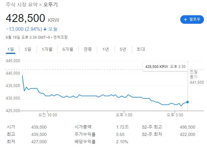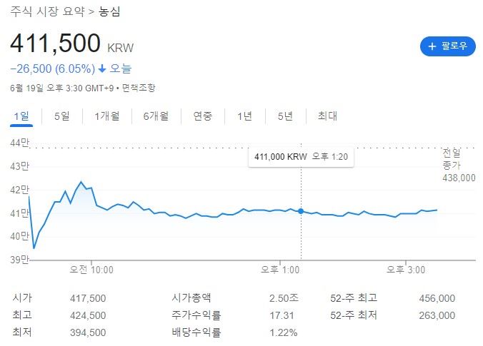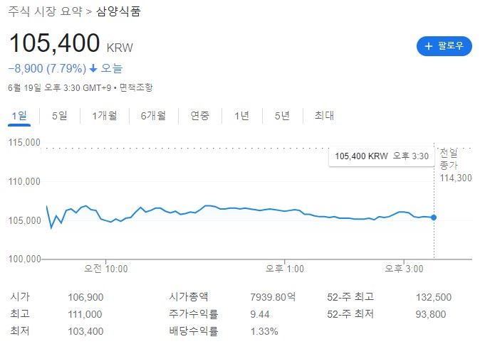 한국거래소에 따르면 농심은 이날 전 거래일 대비 2만 6500원(6.05%) 빠진 41만 1500원에, 삼양식품은 8900원(7.79%) 하락한 10만 5400원에, 오뚜기는 1만 3000원(2.94%) 내린 42만 8500원에 장을 마감했다.