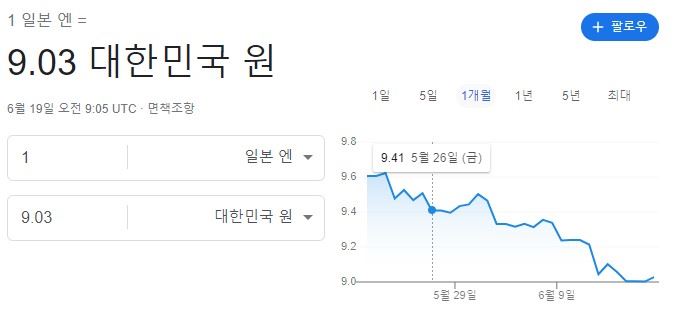 19일 오전 8시 23분 기준 원화-엔화 재정환율은 100엔당 897.49원으로 고시됐다. 원-엔 환율이 800원대까지 내린 것은 지난 2015년 6월 말 이후 8년 만이다. 9시 이후엔 900원대로 재진입했다.